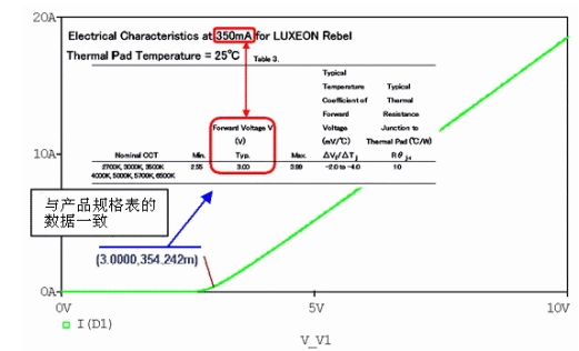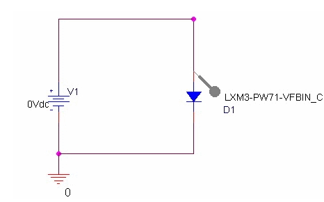 我們用電路仿真來說明LED的電子特性以及驅(qū)動電路。電路仿真是對LED和電阻等的電子設(shè)計進(jìn)行建模并在計算機(jī)上模擬計算電路運(yùn)行的一種簡易方法。這里使用的是Cadence公司的電路仿真PSpice A/D。同時使用了飛利浦照明公司的LUXEON系列LX3-PW71。