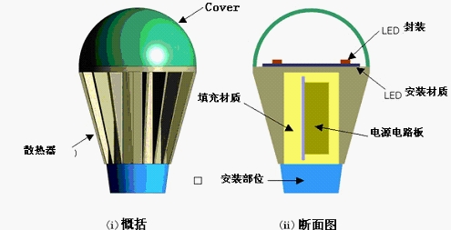 要避免電子設(shè)備的發(fā)熱有多種方法。比如,加散熱器,在熱源周圍安置能提供冷氣的風(fēng)扇。前者是通過增加散熱面積,來增加散熱的通道,后者是使熱不在熱源周圍聚集。但是,正如圖1 LED燈的概括圖所示,LED封裝時不能直接連接散熱器,也沒有安裝風(fēng)扇的位置。而且內(nèi)部電源電路板也會產(chǎn)生熱量,因此LED燈的散熱問題可以說是一個非常棘手的問題。這樣,如何有效使用LED安裝材質(zhì)和散熱器就變得很重要。