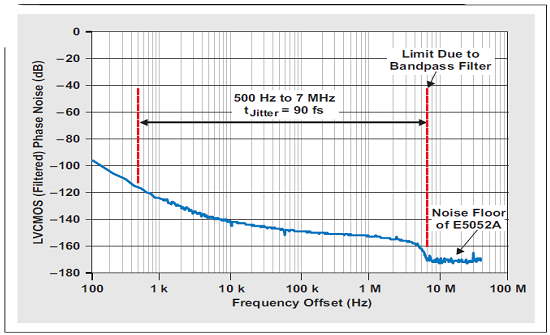 圖 12 所示曲線圖描述了濾波后 CDCE72010 LVCMOS 輸出的測(cè)得輸出相位噪聲。131000 點(diǎn)的 FFT 大小將低積分帶寬設(shè)定為 ~500 Hz。積分上限由帶通濾波器設(shè)定,其影響在相位噪聲曲線圖中清晰可見(jiàn)。超出曲線圖所示帶通濾波器限制的相位噪聲為 E5052A 的噪聲底限,不應(yīng)包括在抖動(dòng)計(jì)算中。濾波后相位噪聲輸出的積分帶來(lái) ~90 fs 的時(shí)鐘抖動(dòng)。