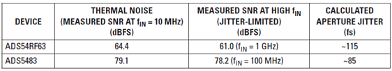 我們知道時(shí)鐘源生成器濾波后輸出的外部時(shí)鐘抖動(dòng)為 ~35 fs,因此我們可以利用測(cè)得的 SNR 結(jié)果,然后對(duì)第 1 部分(請(qǐng)參見(jiàn)參考文獻(xiàn) 1)中的方程式 1、2 和 3 求解孔徑抖動(dòng)值,從而計(jì)算得到 ADC 孔徑抖動(dòng),請(qǐng)參見(jiàn)下面的方程式 4。表 3 列舉了每種 ADC 測(cè)得的 SNR 結(jié)果以及計(jì)算得孔徑抖動(dòng)。