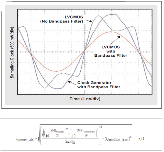 不匹配的原因是,計(jì)算得出的孔徑抖動(dòng)是基于時(shí)鐘源生成器的快速轉(zhuǎn)換速率。CDCE72010 的 LVCMOS 輸出消除了時(shí)鐘信號(hào)的高階諧波,其有助于形成快速升降沿。圖 13 所示波形圖表明了帶通濾波器急劇降低未濾波 LVCMOS 輸出轉(zhuǎn)換速率,以及將方波轉(zhuǎn)換為正弦波的過(guò)程。