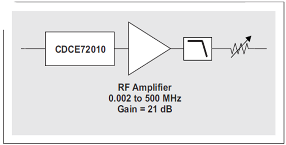 改善轉(zhuǎn)換速率的一種方法是:在 CDCE72010 的 LVCMOS 輸出和帶通濾波器之間添加一個(gè)具有相當(dāng)量增益的低噪聲 RF 放大器,參見(jiàn)圖 14。該放大器應(yīng)該放置于濾波器前面,這樣便可以將其對(duì)時(shí)鐘信號(hào)的噪聲影響程度限定在濾波器帶寬,而非 ADC 的時(shí)鐘輸入帶寬。由于下一個(gè)試驗(yàn)的放大器具有 21 dB 的增益,因此我們?cè)趲V波器后面增加了一個(gè)可變衰減器,旨在匹配濾波后 LVCMOS 信號(hào)到時(shí)鐘生成器濾波后輸出的轉(zhuǎn)換速率。該衰減器可防止 ADC 的時(shí)鐘輸入超出最大額定值。