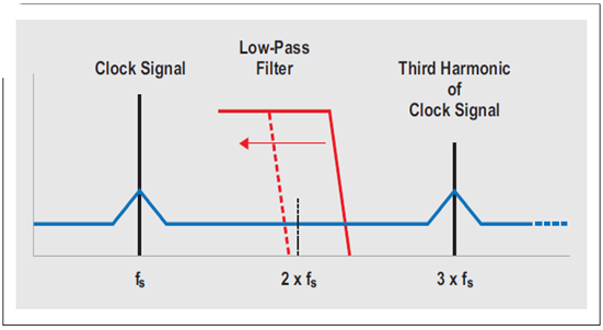 在采樣時(shí)間,基頻正弦波及高階諧波與輸入信號(hào)混頻,如圖 16 所示。(為了簡(jiǎn)單起見(jiàn),僅顯示了一個(gè)諧波。)因此,三階諧波周圍的相位噪聲與輸入信號(hào)混頻,而第三諧波也形成一個(gè)混頻結(jié)果。但是,由于時(shí)鐘信號(hào)的第三諧波的振幅更低,因此該混頻結(jié)果的振幅也被降低。