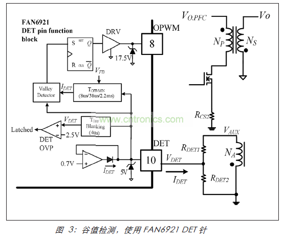 首次進(jìn)行準(zhǔn)共振轉(zhuǎn)換器設(shè)計之前,在前面所述的應(yīng)用說明的幫助下,了解將面臨的主要問題是一件非常值得的事情。正如討論的那樣,可靠檢測 MOSFET 電壓谷值是準(zhǔn)共振轉(zhuǎn)換器操作中的要素。某些 PWM 轉(zhuǎn)換器實施此功能要比其他轉(zhuǎn)換器做得更好,因此在評價競爭對手的設(shè)備時,務(wù)必留意這一點。例如,圖 3 顯示使用 Fairchild FAN6921 PWM 控制器的谷值檢測電路的典型應(yīng)用。通過監(jiān)視流出谷值檢測針 (DET) 的電流來檢測MOSFET的電壓谷值;當(dāng)流出檢測針的電流超過30μA 時,將觸發(fā)該電路。這是特別有吸引力的解決方案,因為它只需要一個變壓器輔助線圈和兩個電阻。