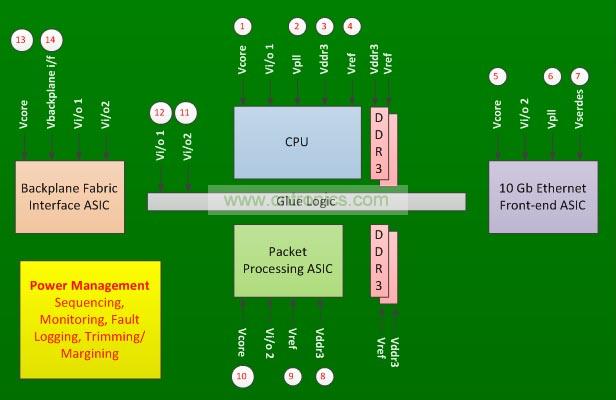 在圖1所示的線卡中,有四個主要的集成電路和一些粘合邏輯。每個集成電路都需要多個電源,并有定序的要求。這塊電路板有14個電源電壓,需要進行監(jiān)測、定序、微調(diào)和裕度調(diào)整。此外,電路板的設(shè)計還需要將任何意想不到的電源故障記錄在非易失性存儲器中。