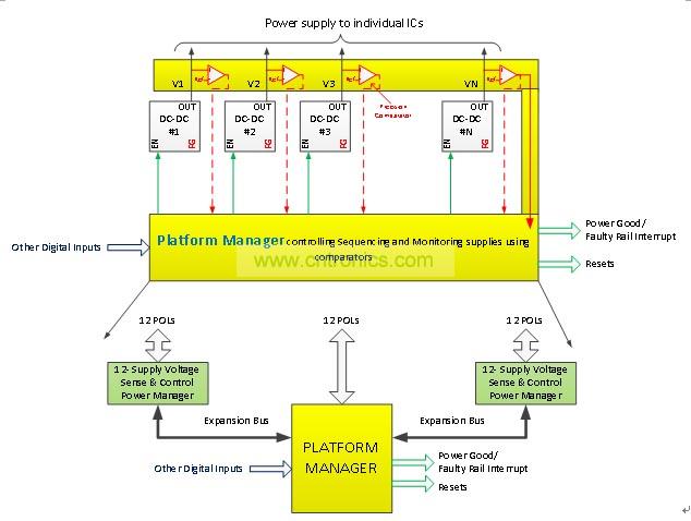 要求CPLD對電路板上超過12個電壓實現(xiàn)電源管理功能,如定序,復(fù)位產(chǎn)生等功能。這些設(shè)計取決于電路板上按裝的DC-DC轉(zhuǎn)換器產(chǎn)生的電源良好信號,用以監(jiān)控這些電壓。然而,精度差的這些電源良好信號會導(dǎo)致電路板功能的可靠性大大降低。增加電路板的可靠性可以通過用精確的比較器替代這些電源良好信號,監(jiān)控DC-DC轉(zhuǎn)換器的實際輸出電壓。