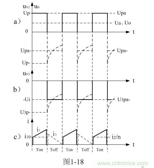 圖1-18-c)是流過變壓器初級(jí)線圈N1和次級(jí)線圈N3的電流波形,其中,實(shí)線部分是流過變壓器初級(jí)線圈N1的電流波形,虛線部分是流過變壓器次級(jí)線圈N3的電流波形。