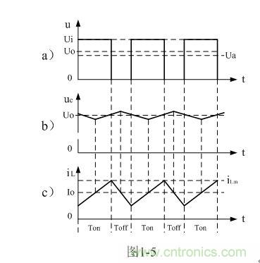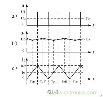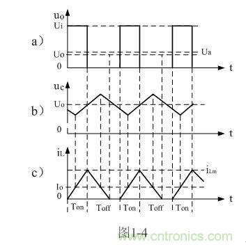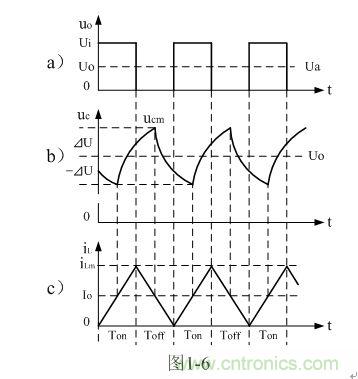在此順便說(shuō)明:由于電容兩端的電壓變化量ΔU相對(duì)于輸出電壓Uo來(lái)說(shuō)非常小,為了簡(jiǎn)單,我們這里把Uo當(dāng)成常量來(lái)處理。在某種情況下,當(dāng)我們需要對(duì)電容的初次充、放電過(guò)程進(jìn)行分析時(shí),必須需要建立微分方程,并求解。當(dāng)開(kāi)關(guān)電源剛開(kāi)始工作時(shí),由于輸出電壓Uo的建立需要一定的時(shí)間,因此,輸出電壓Uo的建立也需要一個(gè)過(guò)渡過(guò)程,如對(duì)此過(guò)渡過(guò)程進(jìn)行精確計(jì)算,得出的結(jié)果中一般都含有一指數(shù)函數(shù)項(xiàng),當(dāng)令時(shí)間變量等于無(wú)窮大時(shí),即電路進(jìn)入穩(wěn)態(tài)時(shí),再對(duì)相關(guān)參量取平均值,其結(jié)果就基本與(1-4)相等。