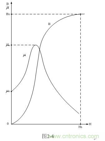 圖2-4是變壓器鐵芯導磁率和磁感應強度對應磁場強度變化的曲線圖。圖中,曲線B為磁感應強度對應磁場強度變化的關(guān)系曲線,曲線