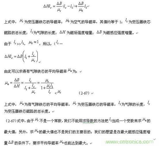 最大值的條件;當(dāng)然是氣隙長度越小,平均導(dǎo)磁率 就越大。但在實(shí)際工作中, 的值要小于此值,因?yàn)椋瑢庀堕L度要預(yù)留一定的余量,變壓器鐵芯的工作點(diǎn)不可能讓永遠(yuǎn)工作在最佳值的邊沿;因此,實(shí)際工作中的變壓器鐵芯,其最大磁感應(yīng)強(qiáng)度增量和最大磁場強(qiáng)度增量都會(huì)超出(2-68)式給出條件的范圍;所以,由(2-68)式求出的氣隙長度 也是最低極限值。
