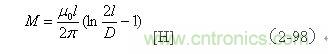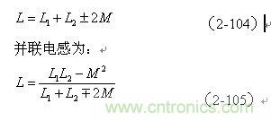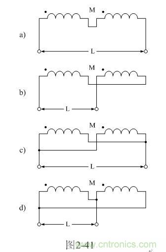 【說明】互感M有正負(fù),圖2-41-a和圖2-41-c的接法互感M為正,圖2-41-b和圖2-41-d的接法互感M為負(fù)。兩個(gè)線圈之間的互感M為: