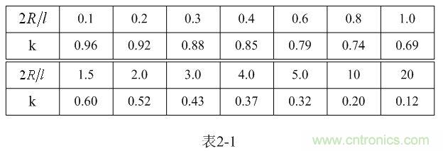 【說明】上式是用來計(jì)算多層線圈繞組、截面為圓形的空心線圈的電感計(jì)算公式。長岡系數(shù)k可查閱表2-1,系數(shù)c可查閱表2-2。當(dāng)線圈內(nèi)部有鐵芯時(shí),有鐵芯線圈的電感是空心線圈電感的