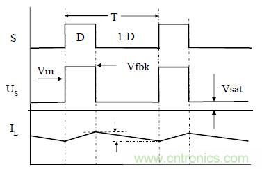升壓變換器與BUCK變換器有著相同的組成部份,只是它們的位置被重新布置了一下。新的布局使變換器與正激式變換器的工作過(guò)程完全不同。在這種情況下,開關(guān)管導(dǎo)通時(shí),電流環(huán)路僅在包括電感,開關(guān)管和輸入電壓源。在這段時(shí)間中,二極管是反向阻斷的。電感電流波形也是以固定斜率上升,可用下式描述:
