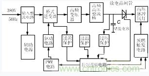 圖1示出電源原理框圖,整個電路可分為主電路(電力變換電路)和控制電路兩大部分。來自電網(wǎng)的380V交流電壓經(jīng)整流濾波后得到約520V左右的直流電壓,加到橋式逆變器上。逆變器主功率開關(guān)采用三菱公司的CT60型IGBT管。PWM電路產(chǎn)生一對相位互差180°的脈沖電壓控制逆變橋的四個功率管,將直流電壓變換為高頻方波電壓,再經(jīng)高頻高壓整流橋得到高壓直流(約1400V),向儲能電容Co充電。電容Co上電壓充到預(yù)定值(1000V)后,控制電路發(fā)出信號,將放電晶閘管觸發(fā)導(dǎo)通,Co上電壓快速向負載氙燈釋放,激光器正常工作。