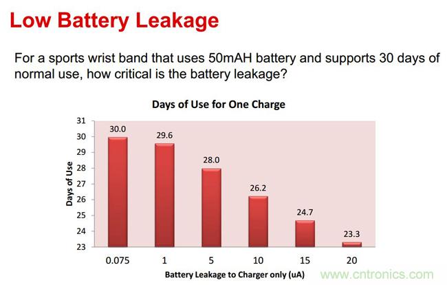 演講中,文博士還提到,可穿戴設(shè)備對于電池模塊的尺寸要求很小,對于電池精度的要求卻是日益提高,如何實現(xiàn)較小的充電終止電流,也是目前急需攻克的難題之一。“基于較小尺寸和充電終止電流的需求,TI推出了為可穿戴設(shè)備等低功耗應(yīng)用量身定制的鋰離子電池充電器:Bq25100。”文博士為我們介紹道,Bq25100采用了0.9×1.6毫米的WCSP封裝,可支持尺寸僅為前代一半的充電器解決方案;Bq25100可以對低至10mA或高達250mA的快速充電電流進行準確控制,同時還可實現(xiàn)低至1mA的充電終止,從而支持微型鋰離子紐扣電池。此外,Bq25100還支持不足75nA的漏電流,可解決因漏電流帶來的電池損耗問題,延長電池使用時間。