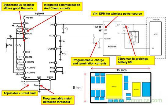 所幸的是,無線充電并沒有那么大的技術(shù)障礙,市面上已經(jīng)有了很多可行的方案出現(xiàn),當前TI也順勢推出了適用于可穿戴設(shè)備的無線充電解決方案,在該方案的接收模塊上,我們可以看到除了應(yīng)用了上述所提及的降壓轉(zhuǎn)換器Bq25100外,還加入了基于Qi標準的無線充電接收器——BQ51003($1.4625)。