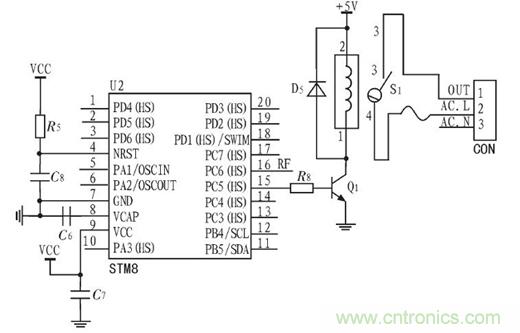 控制模塊主要由處理器單片機(jī)、繼電器和外圍元件組成開關(guān)電源,con端接入交流照明電,AC-L和AC-N分別接入交流電火線和零線,OUT端連接負(fù)載,此系統(tǒng)可以控制多路負(fù)載,實(shí)驗(yàn)中該控制模塊連接了一個(gè)繼電器控制一路負(fù)載,控制模塊電路圖如圖5所示。
