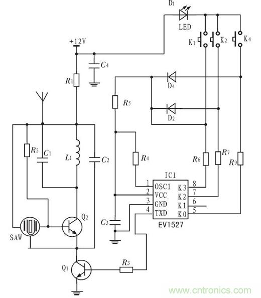 發(fā)送模塊主要由HS1527($1056.0000)無線發(fā)碼芯片、聲表面濾波器、指示燈及濾波電路等組成,發(fā)送模塊作為遙控器來操作,電路圖如圖2所示。當(dāng)按下不同的按鍵K時(shí),發(fā)碼芯片就會(huì)通過天線發(fā)出不同的編碼,編碼經(jīng)過天線發(fā)送到接收模塊由接收模塊將編碼交由控制模塊解析處理,發(fā)送模塊供電電壓12 V,由電池供電。