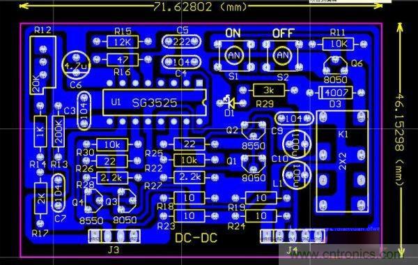 DC-DC升壓驅(qū)動(dòng)板,采用的是很常見的線路,用一片SG3525實(shí)現(xiàn)PWM的輸出,后級(jí)用二組圖騰輸出,經(jīng)實(shí)驗(yàn),如果用一對(duì)190N08,圖騰部分可以省略,直接用3525驅(qū)動(dòng)就夠了。板上有二個(gè)小按鈕開關(guān),S1、S2、S1是開機(jī)的,S2是關(guān)機(jī)的,可以控制逆變器的啟動(dòng)和停機(jī)。