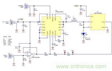 圖1顯示的是一個(gè)通過(guò)高側(cè)感測(cè)電阻器R3直接驅(qū)動(dòng)LED中電流的降壓轉(zhuǎn)換器,TPS54218,同步降壓控制器。這個(gè)電流感測(cè)電壓被電流感測(cè)監(jiān)視器,INA193,放大20倍,這樣可顯著地降低R3中的功率耗散并提升效率。分流監(jiān)視器的電流反饋信號(hào)輸出給電阻分壓器 (R6/R8),這形成了到VSENSE的完整反饋路徑。