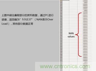 通過(guò)PC讀取波形的數(shù)據(jù),超出量程部分將返回”9.91E37”,如下圖所示: