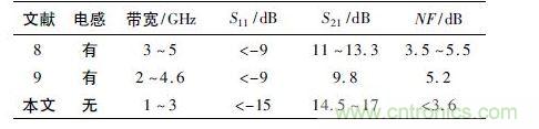 本文設計的寬帶低噪聲放大器與已經(jīng)發(fā)表文獻中的寬帶低噪聲放大器的性能比較如表1 所示,這些文獻均采用0. 18 μm 工藝進行設計,具有一定的比較意義。通過表1 可以看出,本設計中各項參數(shù)都達到了較好的性能指標,避免了傳統(tǒng)集成電路設計中需要采用電感的缺點,而電感通常在電路設計中占用非常大的面積,本文設計的寬帶低噪聲放大器省略了傳統(tǒng)低噪聲放大器設計中的電感,這將在很大程度上減少芯片的面積; 更為重要的是該芯片依靠自身的MOS 管和比例電阻實現(xiàn)了內(nèi)匹配,避免了大批量應用時由于芯片內(nèi)部參數(shù)受工藝參數(shù)影響而造成的外圍匹配電路的更改,簡化了芯片的應用,在實際的工程應用中具有重要的意義。