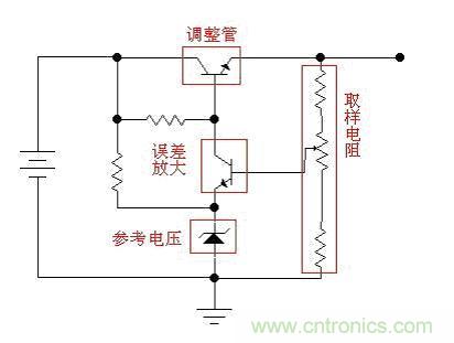 讓我們繼續(xù):如果我們用一個(gè)三極管或者場效應(yīng)管,來代替圖中的可變阻器,并通過檢測輸出電壓的大小,來控制這個(gè)“變阻器”阻值的大小,使輸出電壓保持恒定,這樣我們就實(shí)現(xiàn)了穩(wěn)壓的目的。這個(gè)三極管或者場效應(yīng)管是用來調(diào)整電壓輸出大小的,所以叫做調(diào)整管。