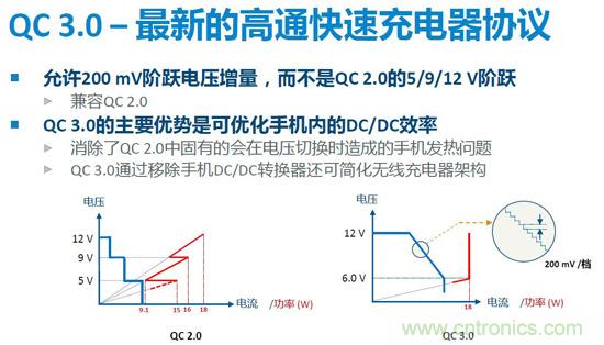 從事電源設(shè)計(jì)開(kāi)發(fā)和技術(shù)支持工作超過(guò)24年的Jason分析道,從線型降壓電源開(kāi)始,電源開(kāi)發(fā)在摸索中前進(jìn),體積越做越小,充電方式也迎來(lái)了新的變革,現(xiàn)在的趨勢(shì)是快速充電。以前的充電器只提供一個(gè)固定的輸出電壓(5V),電源提供的輸出功率取決于輸出電流的大小,輸出電流越大則提供給電池端的功率更大,從而提高充電效率減小充電時(shí)間。但電流不能無(wú)限制的增加,因在輸出電纜的功耗隨電流的增大會(huì)相應(yīng)的增加。因而快速充電應(yīng)用應(yīng)運(yùn)而生。其實(shí)現(xiàn)方法是手機(jī)跟充電器進(jìn)行雙向通訊,電源會(huì)根據(jù)負(fù)載端發(fā)出的指令做出反應(yīng),改變其輸出電壓和電流,實(shí)現(xiàn)減小功率損耗、增大充電功率、減小充電時(shí)間的目的,從而實(shí)現(xiàn)快速充電。