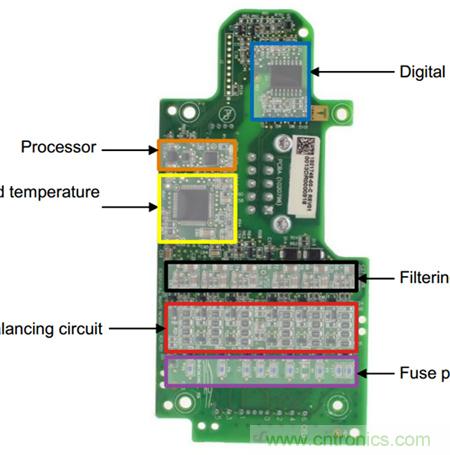 因?yàn)閮煞N均衡功能各有利弊,本來主動均衡功能是可以替代被動均衡功能的,但因?yàn)榻Y(jié)構(gòu)復(fù)雜成本高,而且結(jié)構(gòu)復(fù)雜之后故障率也會高而與被動均衡處于膠著狀態(tài),業(yè)內(nèi)人士常為了哪種均衡更好爭論不休。特斯拉的BMS均衡功能(被動均衡,見下圖中Cellbalancingcircuit中所指均為放電電阻)經(jīng)常被示范以證明被動均衡強(qiáng)于主動均衡。其實(shí)這反而證明了任何技術(shù)選擇都要和整體條件適用的道理。