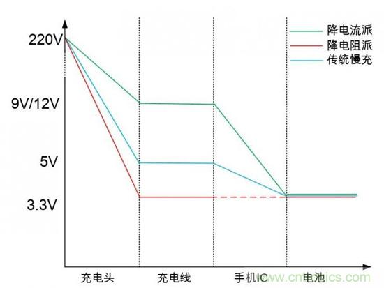 從電壓的角度來(lái)對(duì)比一下傳統(tǒng)慢充、降電阻快充技術(shù)與降電流快充技術(shù),如下圖所示。