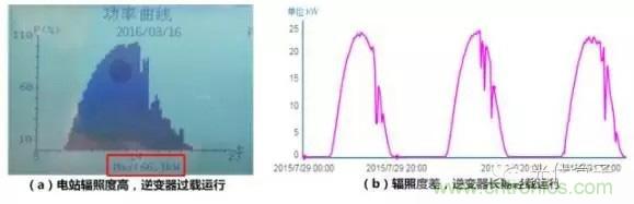湖北某電站采用30kW組串式逆變器,由于所選逆變器的直流輸入能力不足,單臺逆變器直流側(cè)最大只能配置30kWp的組件,即容配比1:1。當(dāng)光照資源相對較差,即使在全年輻照最高時,逆變器實際輸出功率也僅為25kW,如圖1(b)所示。逆變器及