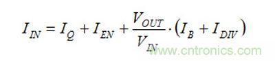 由于這個方程式?jīng)]有將轉(zhuǎn)換器中的損耗算在內(nèi),所以它給出的是一個最佳情況下的估算值。第一個被稱為IQ的數(shù)據(jù)是我在上一部分中談到的非開關(guān)式靜態(tài)電流。下一個數(shù)據(jù)項,IEN 是進入穩(wěn)壓器使能輸入的電流。很多轉(zhuǎn)換器需要一定大小的偏置電流流入使能輸入。如果使能引腳被連接至輸入電源,以接通穩(wěn)壓器的話,那么你必須將這個電流考慮在內(nèi);否則的話,這個值為零。數(shù)據(jù)項IDIV 是反饋分頻器內(nèi)的電流,使用方程式2,可以很容易地計算出這個值: