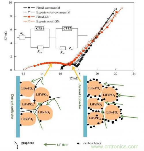 EIS分析顯示,添加石墨烯的實(shí)驗(yàn)組電池的歐姆阻抗要明顯低于對(duì)照組電池,這主要得益于石墨烯的片狀結(jié)構(gòu)能夠于活性物質(zhì)顆粒形成很好的接觸,降低接觸電阻,但是在高頻段的電荷交換阻抗,實(shí)驗(yàn)組電池要明顯高于對(duì)照組電池,這表明石墨烯的加入影響了Li+在電極內(nèi)的擴(kuò)散。仿真結(jié)果顯示,主要是由于石墨烯的片狀結(jié)構(gòu)對(duì)Li+的擴(kuò)散形成了阻礙,導(dǎo)致Li+的擴(kuò)撒路徑延長(zhǎng),從而造成了添加石墨烯的鋰離子電池在大電流下極化增加,導(dǎo)致電池的放電容量下降。而傳統(tǒng)的炭黑、導(dǎo)電碳纖維和導(dǎo)電石墨等材料,由于橫截面較小,因此對(duì)Li+的擴(kuò)散阻礙較小,對(duì)鋰離子電池大電流放電性能影響不大。