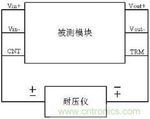 作為模塊電源的重要指標,標準中也規(guī)定了隔離耐壓相關(guān)測試方法,簡單的測試時一般采用等電位連接測試,連接示意圖如下: