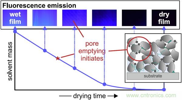 德國(guó)卡爾斯魯厄理工學(xué)院薄膜技術(shù)研究所的Stefan Jaiser等人引入了一種實(shí)驗(yàn)裝置,在涂層干燥溶劑蒸發(fā)過(guò)程中能夠測(cè)量涂層的收縮,涂層表面液體含量,以及表面孔洞消失的過(guò)程。在電極漿料中少量加入一種熒光增白劑,涂層中的液體在UV-A紫外線(xiàn)輻照下能夠發(fā)出藍(lán)光,因而可以用相機(jī)觀察到液相。圖像處理可以估算涂層表面的液體含量,跟蹤電極孔隙中的液相消失過(guò)程。同時(shí),濕涂層的厚度采用二維激光位移傳感器測(cè)量。實(shí)驗(yàn)結(jié)果揭示了液相去除,電極孔隙中開(kāi)始形成的時(shí)刻。