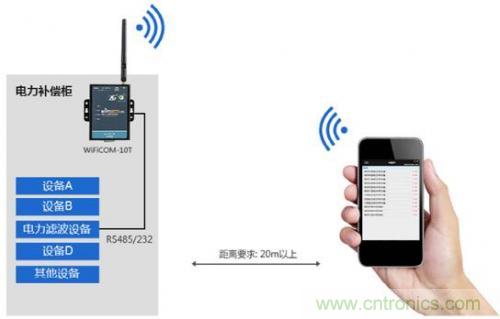 電力補(bǔ)償裝置的巡檢一般需要人工開柜進(jìn)行數(shù)據(jù)的查看、調(diào)整等操作,工作繁瑣切具有一定危險(xiǎn)性,本項(xiàng)目利用WiFiCOM-10T串口轉(zhuǎn)Wi-Fi模塊,在傳統(tǒng)裝置的基礎(chǔ)上利用原有的RS-485/232通訊接口快速進(jìn)行產(chǎn)品升級(jí),將串口數(shù)據(jù)轉(zhuǎn)化成Wi-Fi信號(hào),巡檢人員即可通過手機(jī)或iPad進(jìn)行設(shè)備巡檢,并實(shí)現(xiàn)遙控、遙測(cè)、遙信等功能。