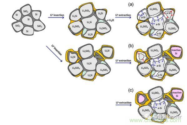 同樣來自韓國的Insoo Choi等[7]還對(duì)SiOX失效機(jī)理進(jìn)行了分析,實(shí)驗(yàn)中Insoo Choi發(fā)現(xiàn),Si/SiOX/C復(fù)合電極的失效模式分為兩類,一類是局部實(shí)效,一類是全面實(shí)效。局部失效主要是在充放電過程中Si/SiOX反復(fù)膨脹,SEI膜變厚,導(dǎo)致活性物質(zhì)顆粒與導(dǎo)電網(wǎng)絡(luò)失去連接,部分嵌鋰的Si顆粒不再參與到充放電反應(yīng)之中,導(dǎo)致電池容量的衰降。全局失效模式主要是因?yàn)檎辰Y(jié)劑失效等原因,導(dǎo)致負(fù)極粉化掉料,引起活性物質(zhì)損失。