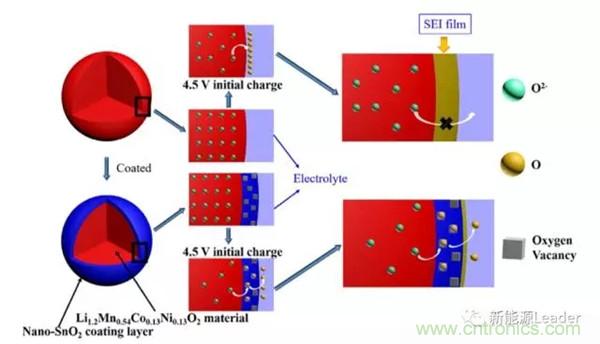 富鋰材料界面穩(wěn)定性差,容易導(dǎo)致副反應(yīng)的發(fā)生,影響電池的循環(huán)壽命,一種有效的解決辦法就是“表面包覆”,例如AlF3、Al2O3和Li3PO4等材料都可以用于富鋰材料的表面包覆,改善富鋰材料的表面穩(wěn)定性。哈工大的杜春雨等等提出了一種SnO2包覆方案,他們利用了SnO2中的氧缺位,促進(jìn)Li2MnO3結(jié)構(gòu)的形成,不僅改善了富鋰材料的循環(huán)性能和倍率性能,還提高了富鋰的材料的容量,達(dá)到了264.6mAh/g,相比于沒有包覆處理的富鋰材料提高了38.2mAh/g,這也為富鋰材料表面改性處理提供了一個新的思路。