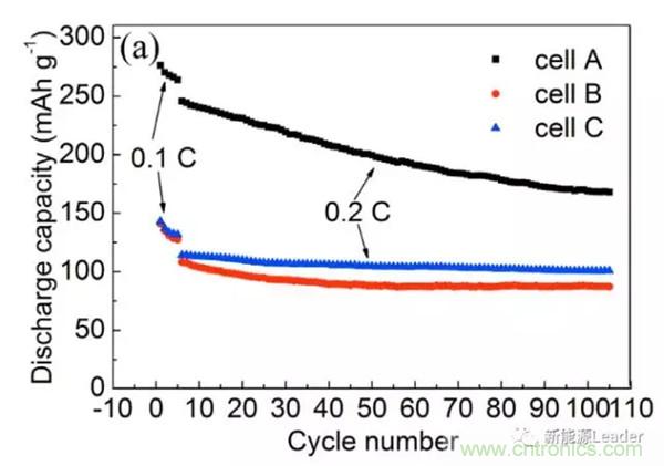 富鋰材料的低溫性能也是阻礙富鋰材料應(yīng)用的一個重要因素,中國工程物理研究院的Guobiao Liu等對于富鋰材料低溫下容量下降的機理做了詳細(xì)的研究,一般認(rèn)為,富鋰材料在低溫下由于活化產(chǎn)生的Li2MnO3材料的數(shù)量較少,導(dǎo)致容量偏低,但Guobiao Liu的研究發(fā)現(xiàn),即便是材料內(nèi)的Li2MnO3含量較高,在低溫下容量發(fā)揮也很低,Li2MnO3含量并不是影響材料容量發(fā)揮的決定性因素,Guobiao Liu認(rèn)為低溫下較差的電極動力學(xué)特性會抑制Mn4+/Mn3+反應(yīng),從而導(dǎo)致材料的容量發(fā)揮較低。循環(huán)性能研究顯示,雖然低溫導(dǎo)致富鋰材料的容量發(fā)揮較低,但是卻顯著的提升了富鋰材料的循環(huán)性能,如下圖所示(電池A在25℃下循環(huán),含有較多數(shù)量的Li2MnO3,電池B,在低溫-20℃下循環(huán)含有較少數(shù)量的Li2MnO3,電池C首先在25℃下活化,然后在-20℃下循環(huán),含有數(shù)量較多的Li2MnO3)。A、B和C三種電池在循環(huán)100次后,容量保持率分別為68.3%、80.9%和88.1%,通過對三種電池中的富鋰材料的結(jié)構(gòu)研究顯示,低溫很好的抑制了富鋰材料從層狀結(jié)構(gòu)向尖晶石結(jié)構(gòu)轉(zhuǎn)變,從而顯著改善了富鋰材料的循環(huán)性能。
