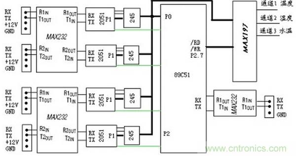 經(jīng)過分析,我們分別使用一塊2051單片機(jī)接收各路串口傳感器的數(shù)據(jù),同時(shí)使用一塊多路高精度ADC對轉(zhuǎn)換成電壓的溫度等信號(hào)采樣,系統(tǒng)結(jié)構(gòu)圖如圖1所示。主從機(jī)之間的具體管腳連接參見圖2。
