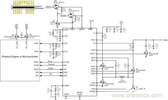 開(kāi)關(guān)頻率,集成4個(gè)MOSFET驅(qū)動(dòng),采用雙沿電流模式控制,支持輸出預(yù)偏置啟動(dòng),自適應(yīng)死區(qū)時(shí)間控制防止直通,具有獨(dú)立的輸入和輸出電流檢測(cè),輸出電壓(范圍0至20V)可以通過(guò)I2C 編程,集成過(guò)壓、欠壓、過(guò)流和精確的過(guò)載保護(hù)等完善的保護(hù)功能,同時(shí)還提供對(duì)5 V Vconn電源的保護(hù)。