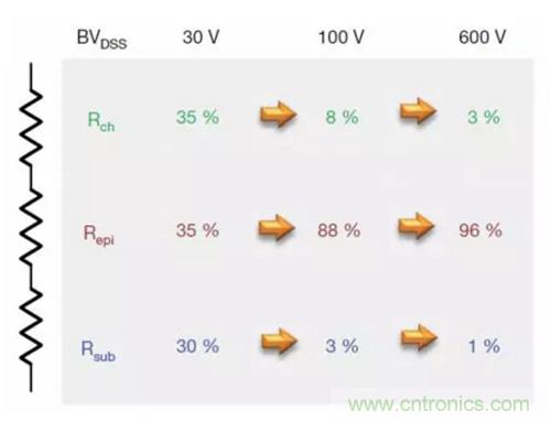 圖2顯示平面式MOSFET情況下構(gòu)成RDS(on) 的各個分量。對于低壓MOSFET,三個分量是相似的。但隨著額定電壓增加,外延層需要更厚和更輕摻雜,以阻斷高壓。額定電壓每增加一倍,維持相同的RDS(on)所需的面積就增加為原來的五倍以上。對于額定電壓為600V的MOSFET,超過95%的電阻來自外延層。顯然,要想顯著減小RDS(on)的值,就需要找到一種對漂移區(qū)進行重摻雜的方法,并大幅減小epi電阻。