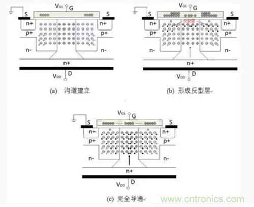 當G極加上驅(qū)動電壓時,在G極的表面將積累正電荷,同時,吸引P區(qū)的電子到表面,將P區(qū)表面空穴中和,在柵極下面形成耗盡層,如圖5示。隨著G極的電壓提高,柵極表面正電荷增強,進一步吸引P區(qū)電子到表面,這樣,在G極下面的P型的溝道區(qū)中,積累負電荷,形成N型的反型層,同時,由于更多負電荷在P型表面積累,一些負電荷將擴散進入原來完全耗盡的垂直的 N+,橫向的耗盡層越來越減小,橫向的電場也越來越小。G極的電壓進一步提高,P區(qū)更寬范圍形成N型的反型層,最后,N+區(qū)域回到原來的高滲雜的狀態(tài),這樣,就形成的低導(dǎo)通電阻的電流路徑,如圖5(c)所示。