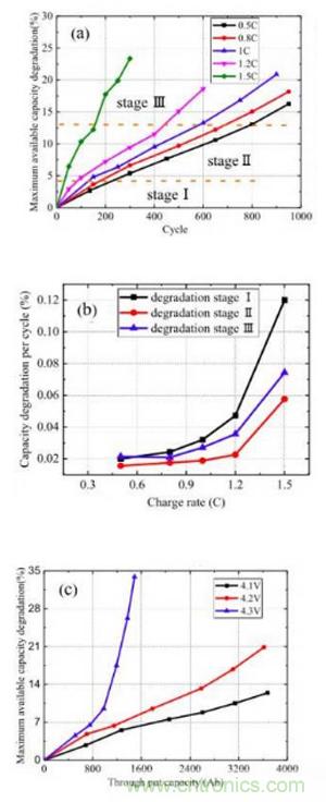 從數(shù)據(jù)可以看到,隨著充電的倍率的加大,鋰離子電池的衰降速率也在快速增加,并且從曲線的斜率來看,電池的衰降速度存在三個不同的階段,前期衰降速度較快的階段(階段1),中間衰降速度較慢的穩(wěn)定階段(階段2),和后期的衰降速率加速階段(階段3)。針對三個階段電池的衰降機理的研究認為,階段1可能是因為電池SEI膜生長需要消耗一部分Li+,因此衰降速度較快。在階段2隨著SEI膜結(jié)構(gòu)的穩(wěn)定,內(nèi)部較為穩(wěn)定,因此衰降速度較慢,在階段3隨著電池老化,開始發(fā)生活性物質(zhì)損失,電極活性界面減少,導(dǎo)致電池對于電流十分敏感。圖C是針對不同的截止電壓對電池衰降速度影響的實驗,從實驗結(jié)果可以看到,當(dāng)把充電截止電壓提高到4.3V時會導(dǎo)致電池的循環(huán)性能急劇惡化,降低充電截止電壓可以有效的改善電池的循環(huán)性能。