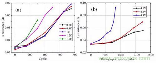 對電池的動態(tài)內(nèi)阻分析如下圖所示,從圖a測試結(jié)果來看,當(dāng)充電電流小于1C時,電池動態(tài)內(nèi)阻隨著電池循環(huán)的變化趨勢幾乎時一樣的,但是當(dāng)充電電流超過1C時,電池動態(tài)內(nèi)阻增加速度會隨著充電速率的增加而快速增加。從圖b的測試結(jié)果來看,當(dāng)充電截止電壓為4.3V時,電池動態(tài)內(nèi)阻增加非常迅速表明高截止電壓會惡化電池的動力學(xué)條件,截止電壓為4.1V和4.2V時電池動態(tài)內(nèi)阻增加較為緩慢。