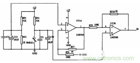 本系統(tǒng)是采用了熱敏電阻進行電池本身的溫度檢測。與電橋電路結(jié)合,將溫度信號反映為電壓信號。電路如圖3-4。