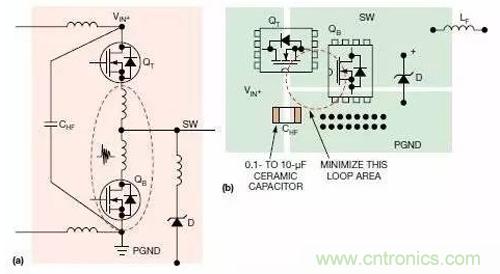圖5.本圖顯示的是升壓轉換器中的熱回路與寄生PCB電感(a);為減少熱回路面積而建議采用的布局(b)。