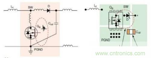 圖4顯示的是升壓轉換器中的連續(xù)電流回路與脈沖電流回路。此時,應在靠近MOSFET QB與升壓二極管D的輸出端放置高頻陶瓷電容CHF.