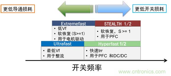 根據(jù)不同的應用,整流器可選擇更低導通損耗或更低開關損耗的產品,各類產品的主要特點及應用如圖2所示。
