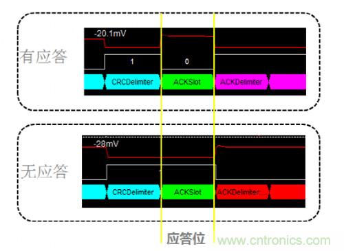 為什么會發(fā)生這種錯誤呢?發(fā)送報(bào)文的節(jié)點(diǎn)會在ACK段發(fā)送兩個隱性位,若在第一個位期間接收到顯性電平則認(rèn)為該幀被正確接收。由于仲裁段相同時(shí)兩節(jié)點(diǎn)都認(rèn)為自己取得仲裁權(quán),在ACK段等待應(yīng)答,但該網(wǎng)絡(luò)中僅存在兩個節(jié)點(diǎn),因此在ACK段不能收到應(yīng)答,進(jìn)而發(fā)生應(yīng)答定界符錯誤。簡單說來這種情形就類似于總線中只有一個節(jié)點(diǎn)將不能實(shí)現(xiàn)數(shù)據(jù)發(fā)送。圖7是在ACK段有無應(yīng)答時(shí)的波形對比。